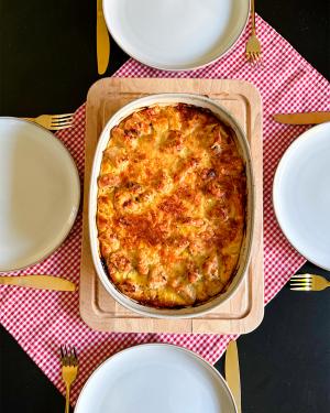 Préchauffez le four à 200°C. Recouvrez de fromage râpé et enfournez pour 30 min.